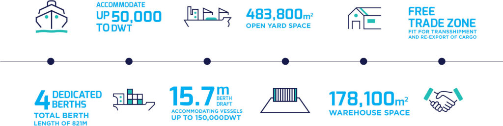 With a dedicated berth of 258m wharf length and a maximum draft of 12.1m, we are able to accommodate vessels of up to 50,000DWT.